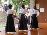 ゴム弓やヒモ弓から始めた練習も本物の弓を射場から引くところまでになりました。